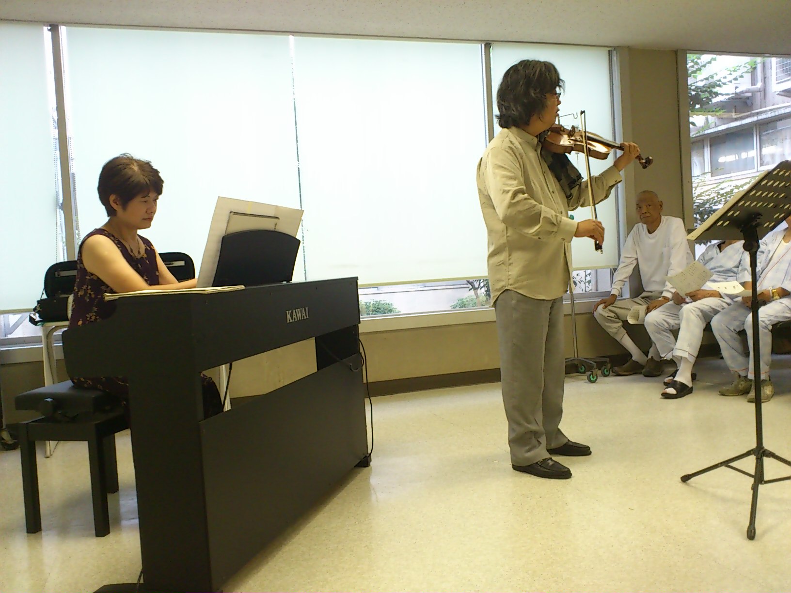 私たちのコンサートは、基本的に高齢者を意識したものです。病院に入院している患者さんは圧倒的に高齢者が多く、楽しみが少ないのも高齢者だからです。ですから、歌を一緒に歌うことを必ずプログラムに入れ、歌曲をヴァイオリンで弾く時は、できるだけ歌を聴いているような気分を味わえるように、と思いながら演奏しています。
