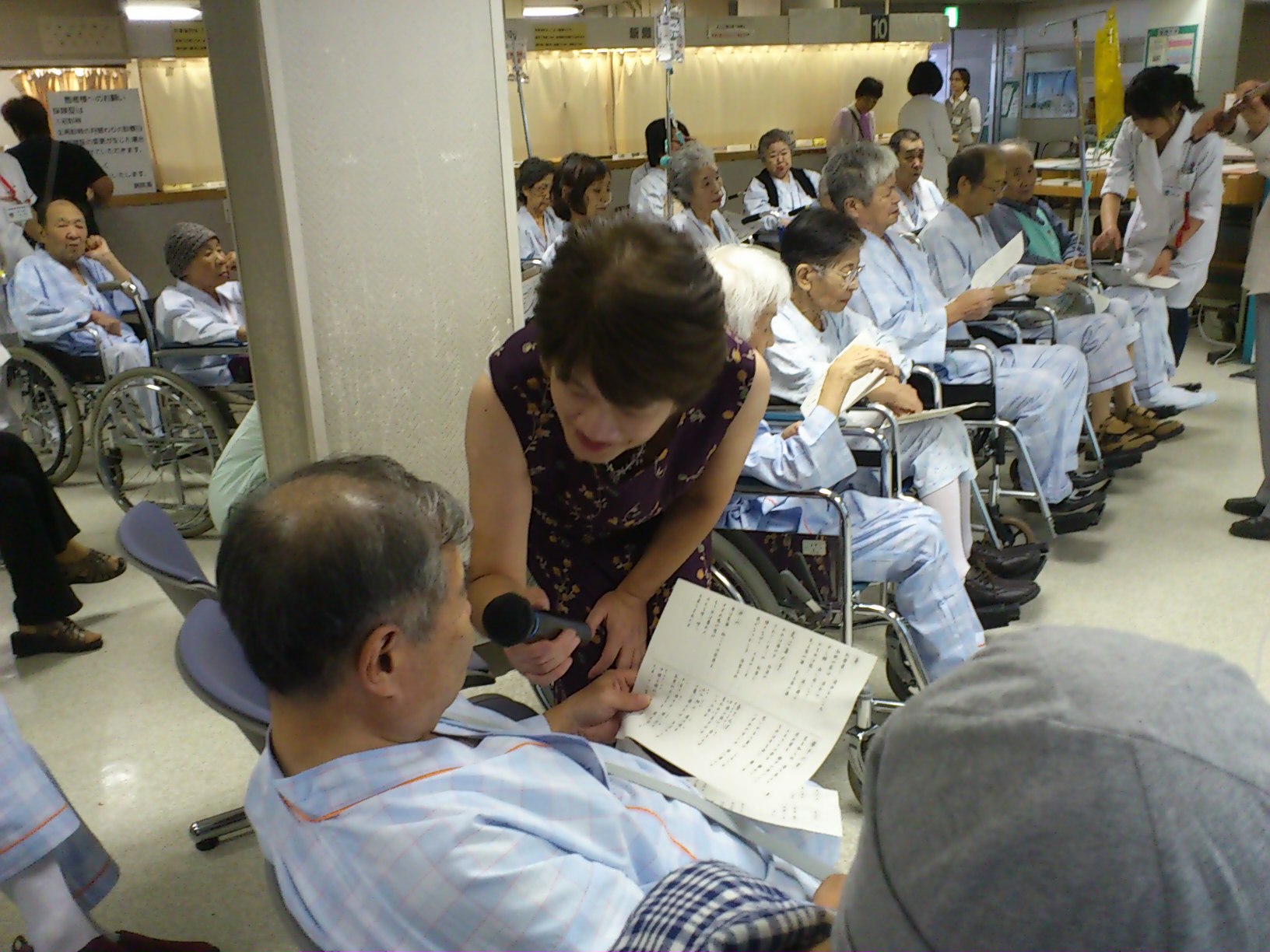 終了後、男性の入院患者さんから声がかかりました。「私も病院でボランティアをやってるんです。民謡ですけどね」どうやら、地元で活動されている方のようでした。本来なら、地元の方がたくさんこのような活動に参加されるとよいのでしょうね。しかし、あるスタッフが話してくれましたが「やってくると、学芸会みたいなこともあって難しい」のだそうです。できるだけ、このような活動は続けていきたいと思っています。