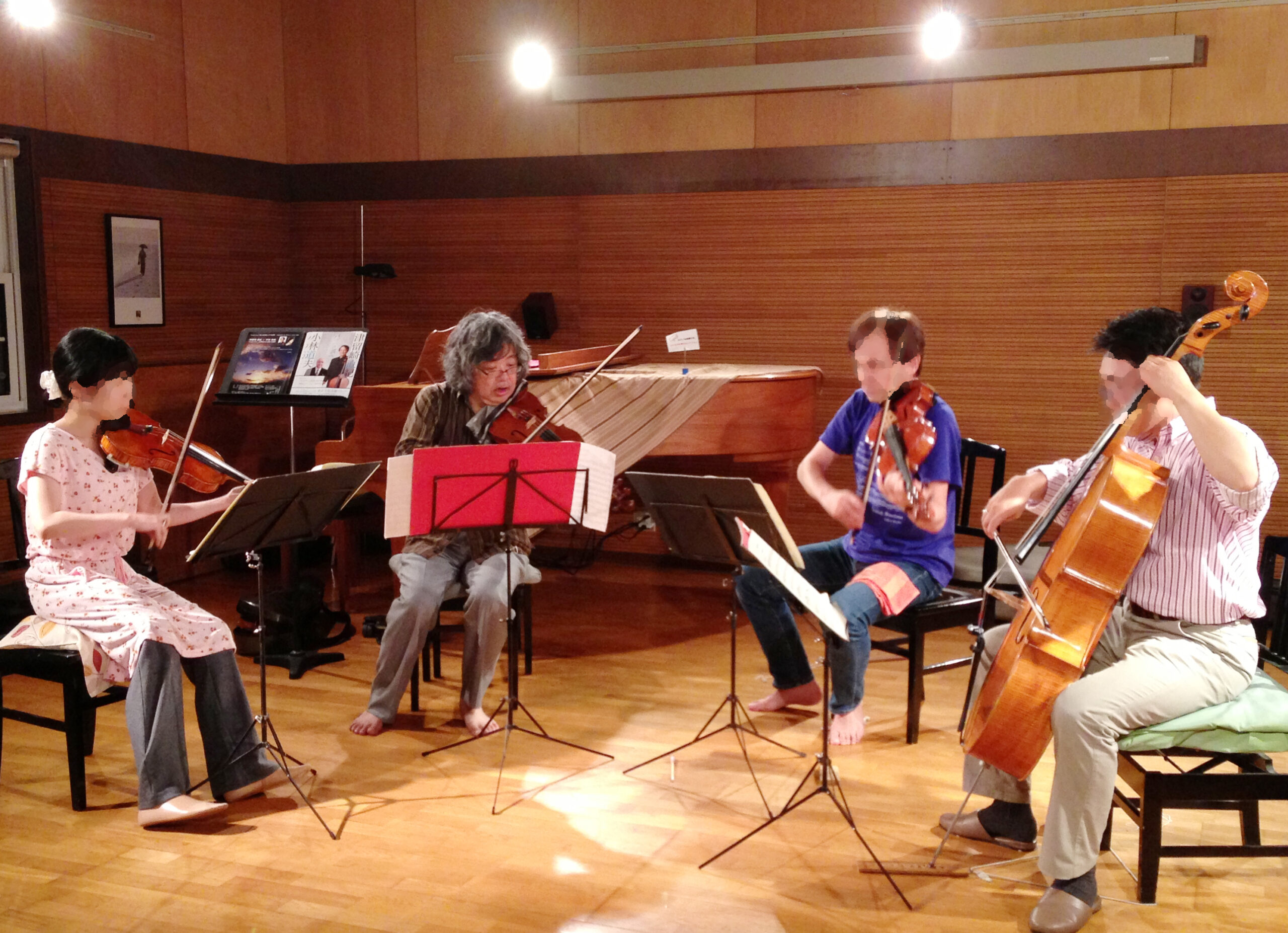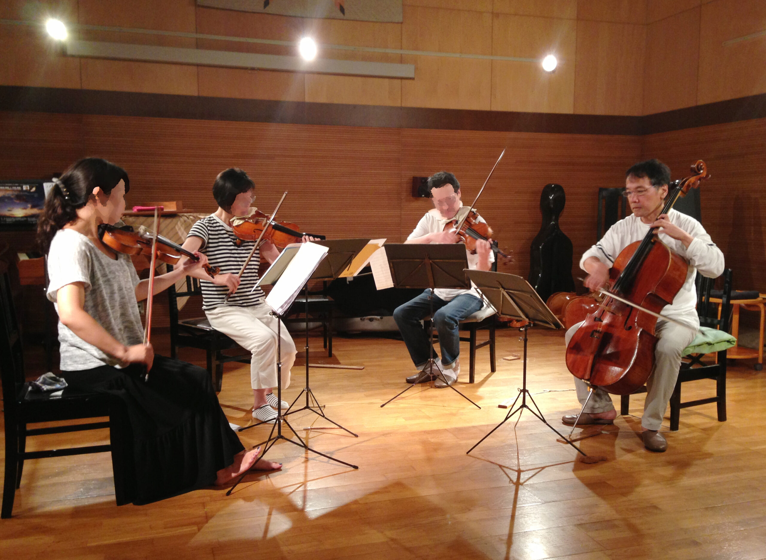 私たちの合宿は、とても「贅沢」なものです。通常、二人の先生(私ともうひとり。例年だと私のアシスタントをしてくれている長谷川先生ですが、今回は津留崎さんにお願いしました)と、アマチュアのベテランたち(アマチュア・オーケストラではトップを弾いているような人たち)に、生徒を挟んでカルテットを練習するのが基本形。なかなかこのような体験はできないので、楽しく「引っ張ってもらう」ことが目的です。初期の頃は、トレーナー役も初見(ではなく、何十回目の初見、という曲がほとんどですが)で弾けるような曲ばかりでしたが、最近の曲はそうはいきません。ヴォランティアでお手伝いしていただいているトレーナー役のみなさんには、本当に感謝です。